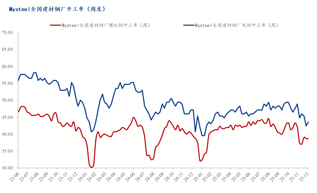 截止12月底,全國建筑鋼材鋼廠螺紋鋼和線材開工率環(huán)比均有一定下降。12月25日,螺紋鋼開工率為38.56%,較上月下降3.27個百分點,線材開工率42.44%,較上月下降6.4個百分點。分工藝來看,長流程企業(yè)螺紋鋼開工率環(huán)比下降3.65個百分點,長流程線材開工率下降6.71個百分點;短流程螺紋鋼開工率環(huán)比下降2.35個百分點,短流程線材開工率環(huán)比下降4.76個百分點。