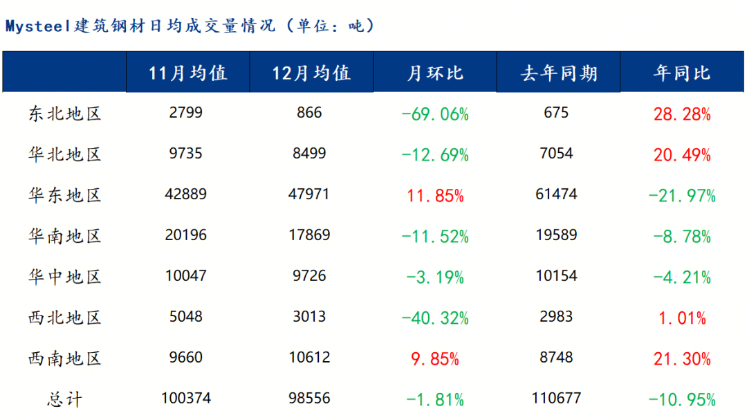 12月份全國建筑鋼材周產(chǎn)量先降后升,全月整體相對偏低。分區(qū)域來看,以螺紋鋼為例,七大區(qū)域周產(chǎn)量環(huán)比一增六降,其中西南小幅上升,其他區(qū)域均有所下降。