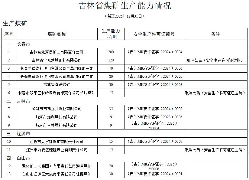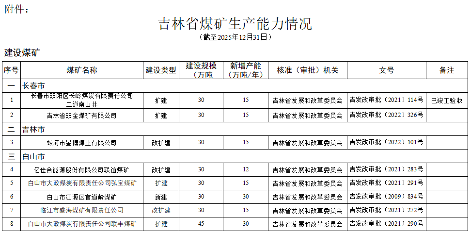 附件:吉林省煤礦生產(chǎn)能力情況(截至2025年12月31日)