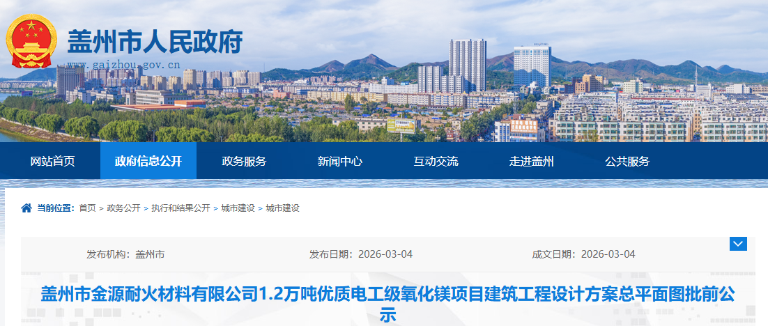 蓋州市金源耐火材料有限公司(2025年1月6日變更為蓋州市匯佳耐火材料有限公司)1.2萬噸優(yōu)質(zhì)電工級氧化鎂項目,規(guī)劃用地性質(zhì)為工業(yè)用地,項目用地面積為15942平方米。現(xiàn)建設(shè)單位已委托設(shè)計單位按照相關(guān)技術(shù)標(biāo)準(zhǔn)和規(guī)范優(yōu)化完善了建設(shè)工程規(guī)劃設(shè)計方案,現(xiàn)將規(guī)劃設(shè)計方案予以公示并公開征求相關(guān)厲害關(guān)系人意見。