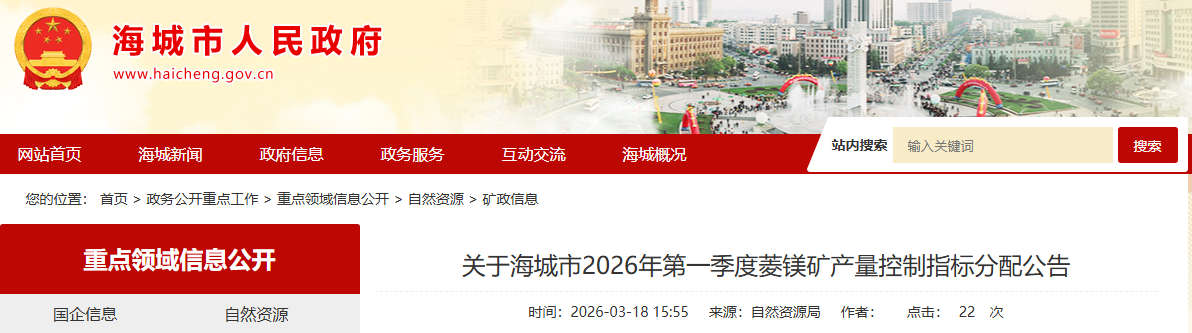 關(guān)于海城市2026年第一季度菱鎂礦產(chǎn)量控制指標(biāo)分配公告?